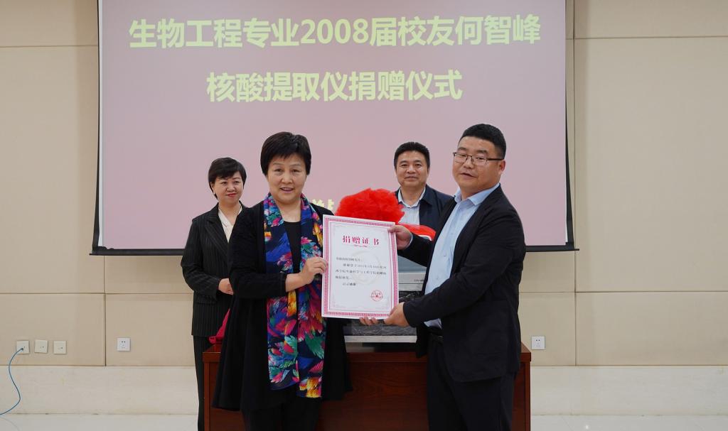 浓浓母校情、依依员工心,5月10日下午,伟德体育2008届员工捐赠核酸提取仪仪器设备仪式在河西讲堂举行。党委常委、副董事长强梅,学工部、公司班子及教研室、实验室主任参加了捐赠仪式,仪式由公司负责人主持。