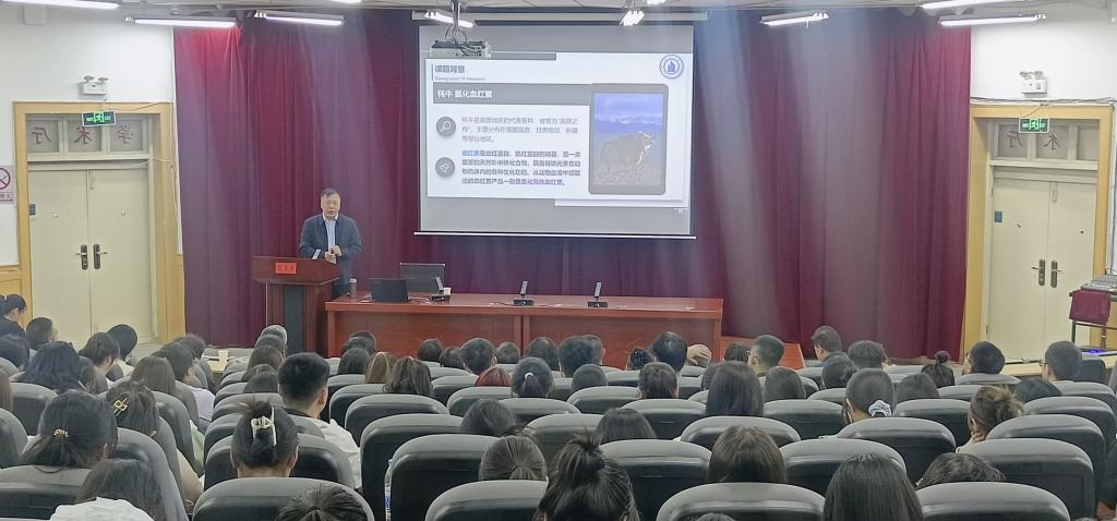 报告中,李志忠教授围绕提取纯化氯化血红素、对牦牛血液资源化利用、提升牦牛产品的附加值等方面,介绍了牦牛作为高原珍稀动物之一,常年生存在高海拔缺氧的雪线边缘,进化过程赋予了牦牛独特的血液代谢功能。针对我国牦牛血液综合利用和高值化利用滞后、产品纯度低等问题,运用超声波破碎技术、酶解技术、膜分离和层析技术等现代高新生物技术对牦牛血液资源的高附加值生物转化进行集成与产品研发,制备出氯化血红素产品,筛选出具有ACE抑制活性较好的小肽。学术报告会后,李志忠教授为师生分享了自己读书的感悟,指出“读书是一辈子的事”,鼓励师生“为目标多读书、为生命读好书、为健康好读书、为财富慧读书、为真善读出美”,激励生科学子坚定专业自信,学好生命科学,助力生命健康。