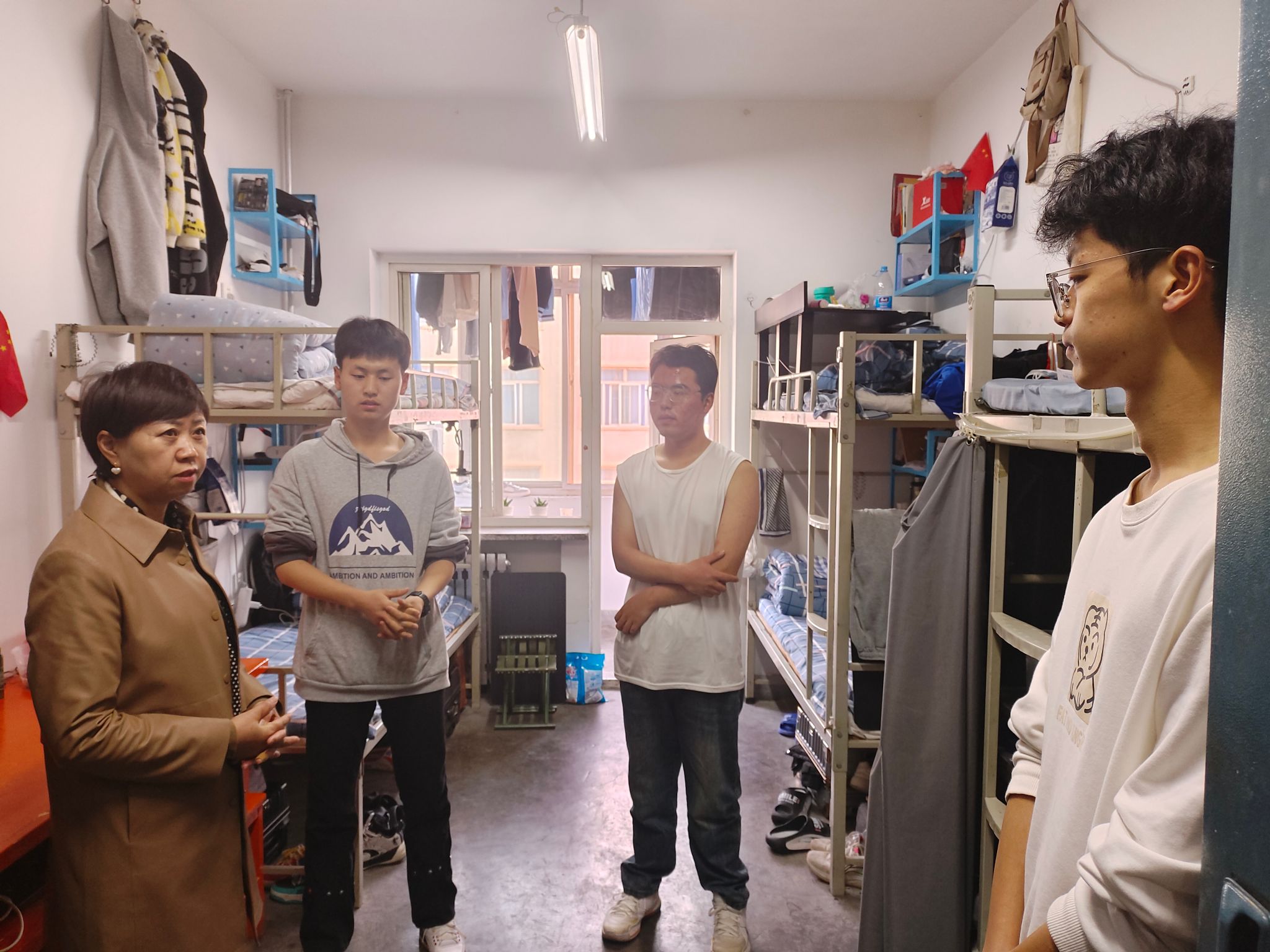 在宿舍,老师们仔细检查了宿舍内的电器电源设备、有无使用大功率电器等情况,叮嘱同学们要增强安全防范意识,注意宿舍用电安全,防范各类安全隐患,共同维护校园安全稳定。同时,对宿舍卫生状况进行了全面检查,鼓励同学们积极营造整洁、舒适的居住环境,对存在卫生问题的宿舍提出了整改要求,引导同学们养成良好的卫生习惯。在走访过程中,老师们与同学们亲切交流,深入了解他们在学习、就业、考研等方面的困惑和需求,鼓励大家明确学习目标,勤奋学习,掌握扎实的专业知识,积极参与科研和社会实践活动,全面提升综合素质;激励考研上线同学多与导师沟通,坚定信念,认真充分准备复试;向就业员工分析当前就业形式,鼓励大家增强就业信心,转变就业观念,提升就业竞争力,把握机遇积极主动就业创业。