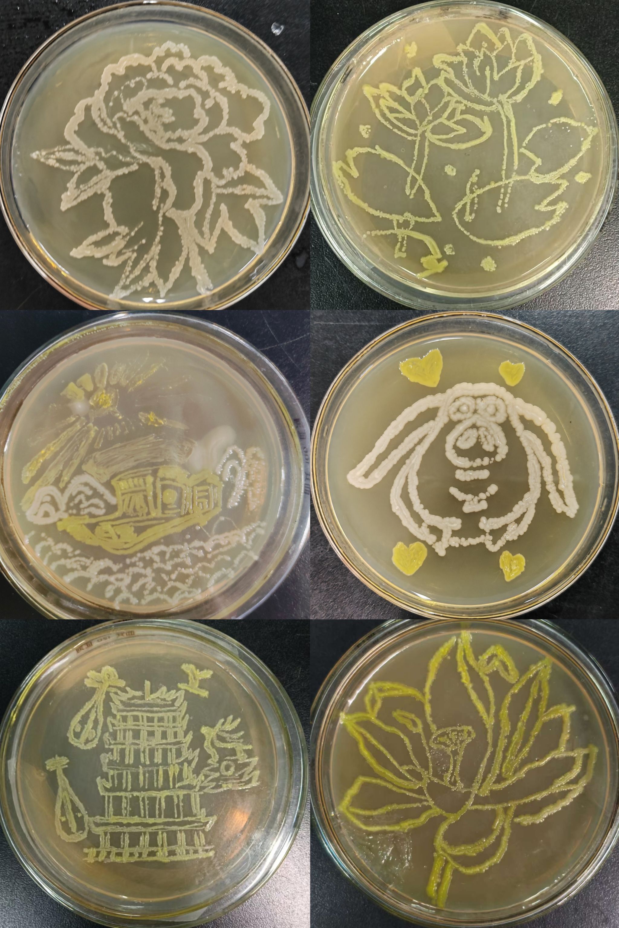 大赛围绕“创意性、科学性、原创性、安全性”四大核心要求展开。参赛选手需要利用微生物培养技术完成一件兼具科学原理与艺术美感的作品,作品不仅需体现微生物的生长特性与形态结构,还需通过艺术设计展现独特创意。选手们以微生物菌落为“画布”,通过控制菌种分布与培养条件,绘制出特色建筑、美丽花卉、抽象图案等作品,将菌落培养的技术符号化为艺术元素,赋予作品更深层的科学内涵。评委从科学性、艺术性、创新性等多维度对作品进行综合评分,最终评选出了一、二、三等奖共6名。